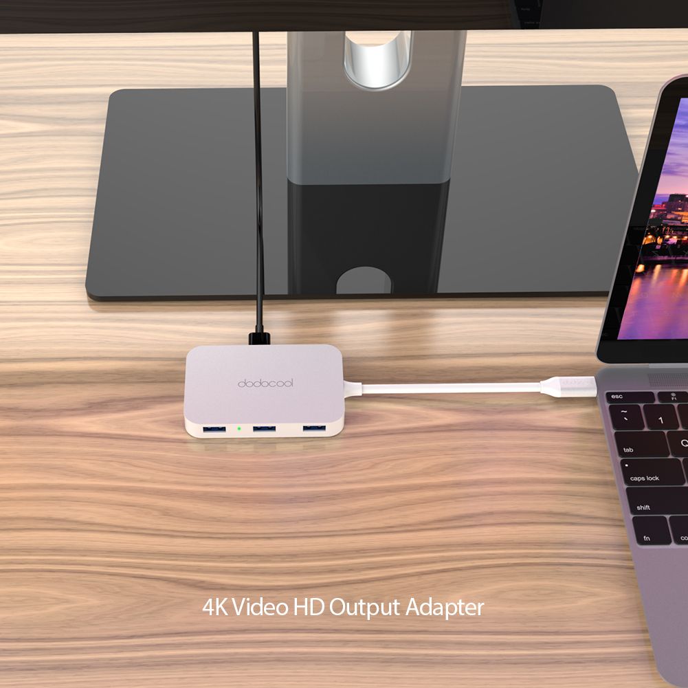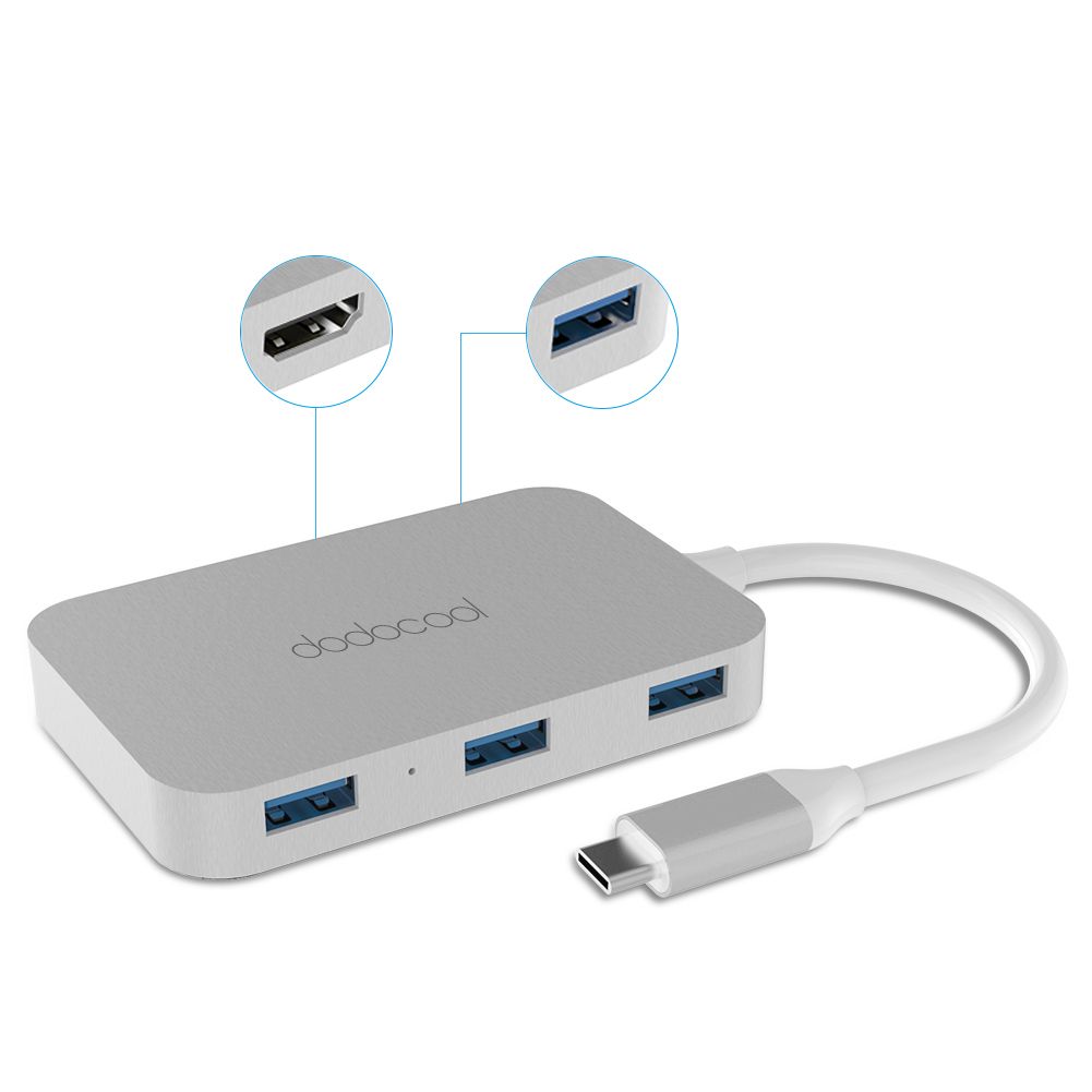 Overviewdodocool Aluminum Alloy USB-C to 4-port USB 3.0 Hub with HD Output Port provides four USB 3.0 Type-A ports and one HD output port via a single USB-C port on your PCs. Each USB 3.0 port supports data transfer rates of up to 5 Gbps. The HD output port allows you to mirror your USB-C laptop display to your HDMI-enabled TV or display with the resolution up to 4K. Hot swappable, plug and play and no drivers needed. It is an ideal extension solution for laptops with a USB-C port.