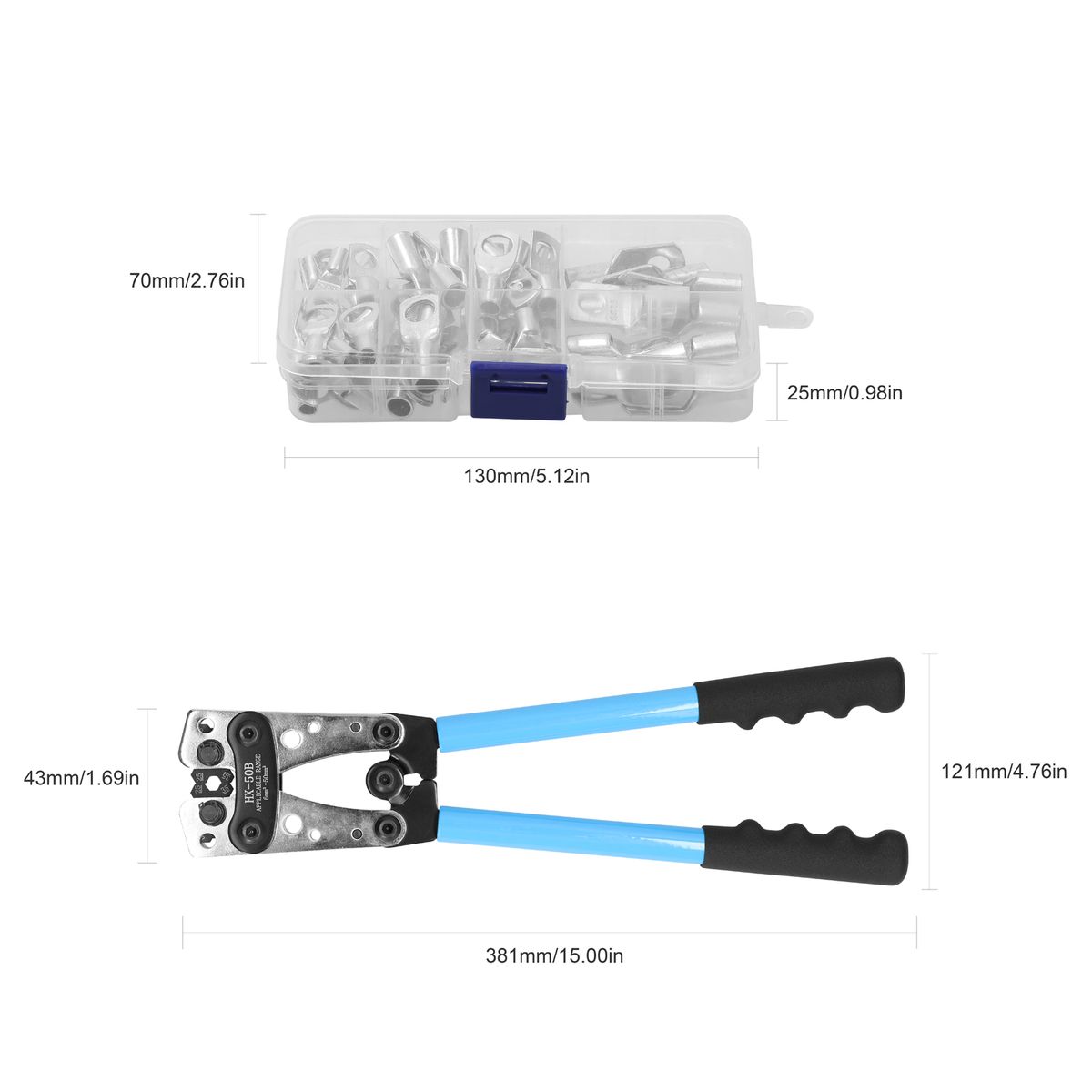 This set includes 1pcs crimping pliers, 60pcs terminals and 1pcs plastics box for neat and tidy storage. The crimper is made of high strength alumium material, with higher hardness, longer lifespan and can provide a better crimping effect. The terminals are made of quality copper material with high conductivity for maximum current. They are useful tools for crimping small to medium sized copper connectors for heavy crimp work to meet your different needs.