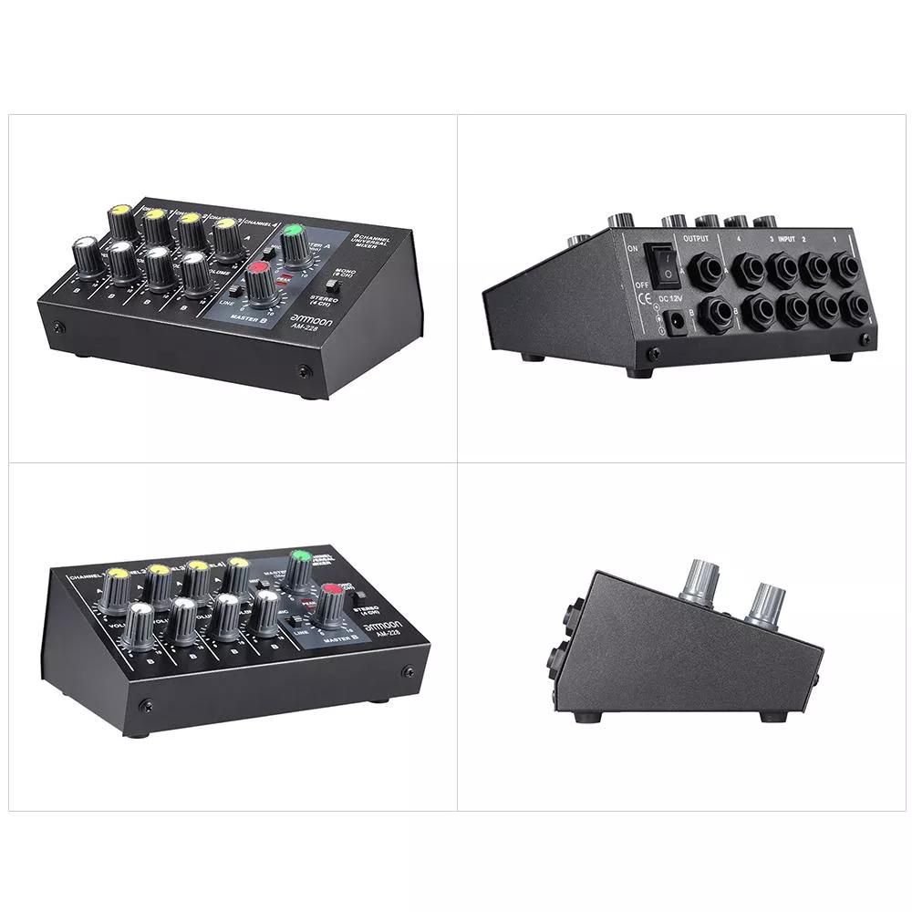 Audio mixer with 8 channels input and 2 channels output. Each input channel can be adjusted volume individually.