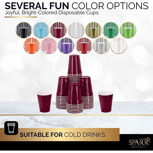 - ✓SPECS - Party cups disposable hold 12 oz of and can be fitted with a Lid. Colorful plastic cups come in 13 vibrant colors Black, Orange, Clear, Lime, Purple, White, Blue, Green, Red, Pink, Gold, Burgundy, and Silver.