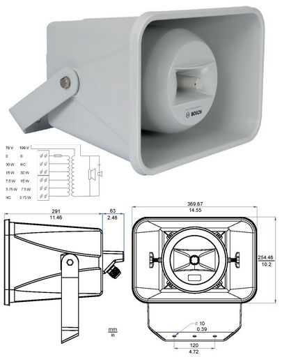 Specification: Input Power: 40W RMSPower Taps: 40/20/10/5WImpedanc: 250/500/1k/2kΩFrequency Response: 120-16,000HzSPL at 1kHz: 98dB/1W/1m; 114dB/40W/1mDimensions: W370 × H255 × D300 mmWeight: 5.90kgMaterial: ABS (UV Protected)