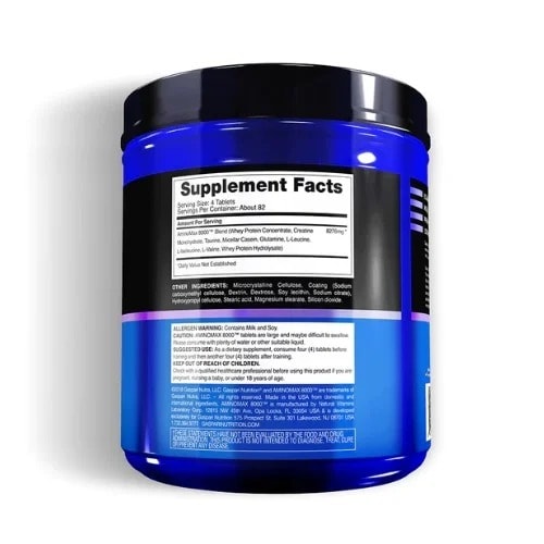 Gaspari Nutrition Amino Max 8000 - 325 TabsGaspari Nutrition Amino Max 8000 is ,Designed for Advanced Athletes and Bodybuilders,Enhanced with Creatine, Taurine and BCAA's and Promotes Size, Strength & Endurance Increase. A Dietary Supplement of about 82 Servings, 8 Grams of Amino Acids,which Increases Size, Strength, and Recovery and Prevents Muscle BreakdownUse as Pre or Post-Workout.