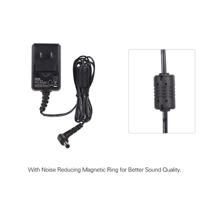 Input voltage is 100-240V 50/60Hz, max input current is 0.3A; output voltage is 9V, output current is 0.5A.