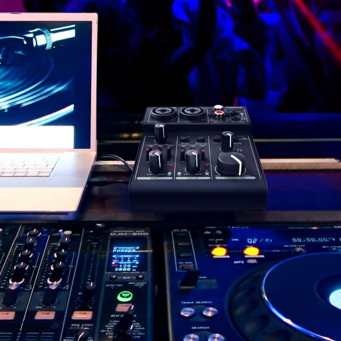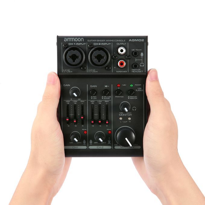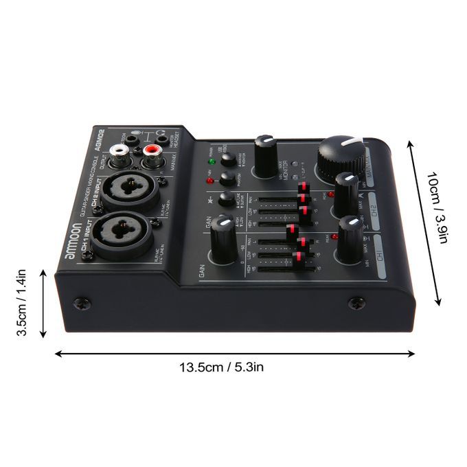 Super mini 2-channel mixing console designed for home stuido recording, network live broadcast, karaoke, etc; 5V low voltage supply design, can be powered by computer or 5V through the including USB cable, easy to carry and convenient to use.
