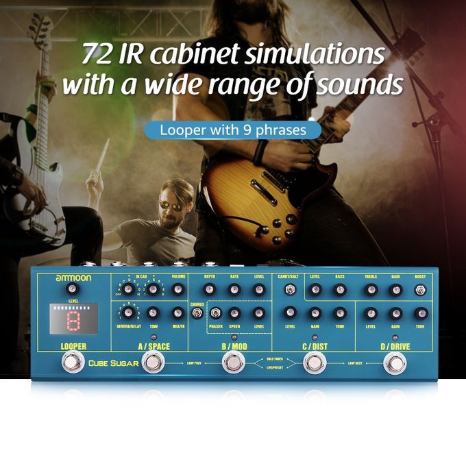 Combined effects pedal with 72 IR cabinets simulation, wide range of sound; 5 analog effects (boost(+15dB), overdrive, distortion, chorus, phaser); 2 digital effects (delay, reverb).
