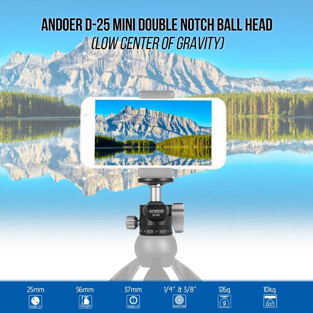 Buy Andoer D-25 CNC Machining Aluminum Alloy Double Notch Ball Head Mini Ballhead Low Center of Gravity for Manfrotto etc Tripod Monopod for Canon Nikon Sony DSLR ILDC Cameras Max Load Capacity 10kg in Nigeria