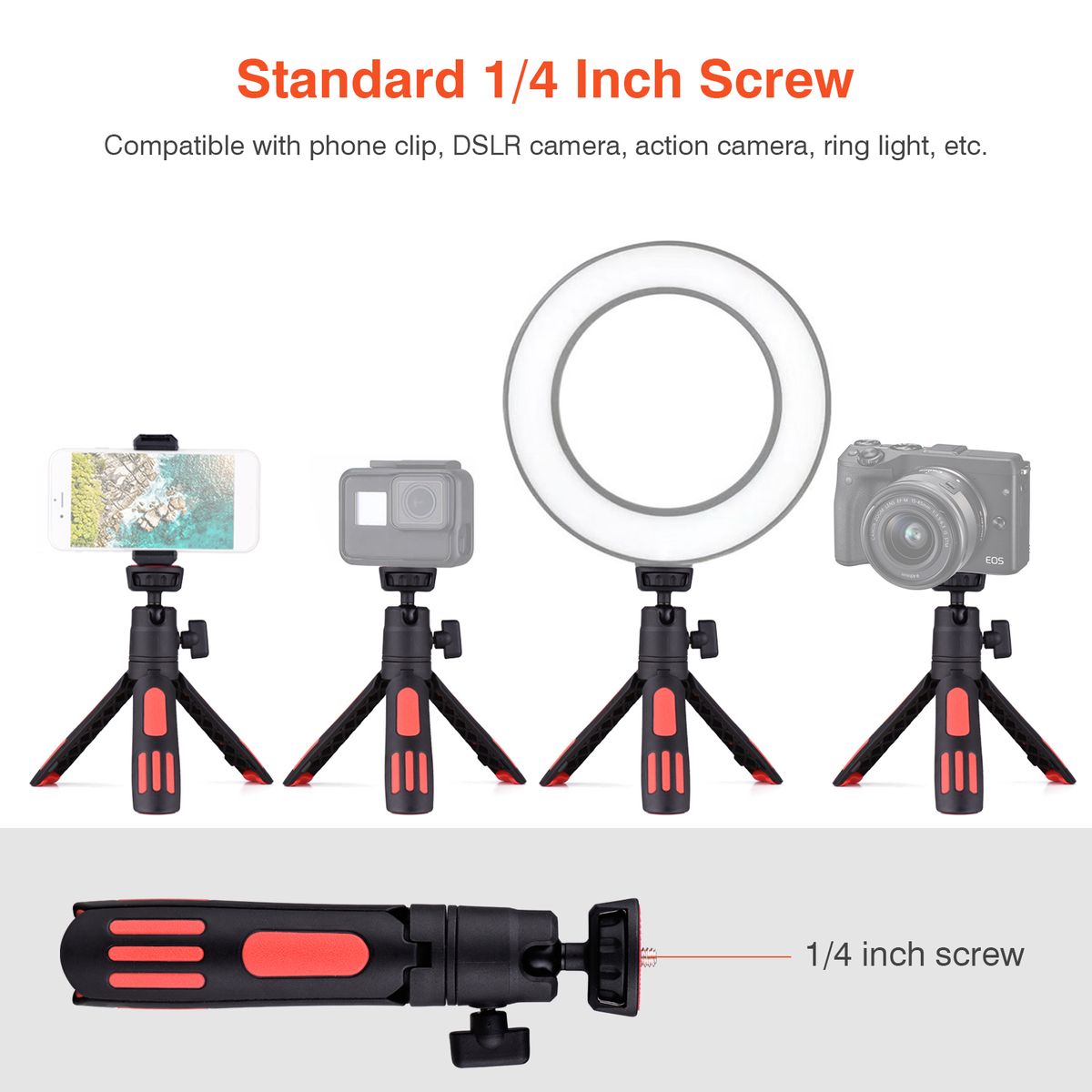 Standard 1/4 inch screw, works well with cameras, ring lights and phone holders with 1/4 inch screw hole, easy to install through the locking wheel.
