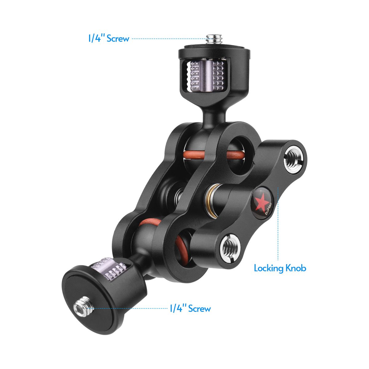 There are dual screw holes(1/4 inch or 3/8 inch) on the locking knob for more powerful accessories extension.