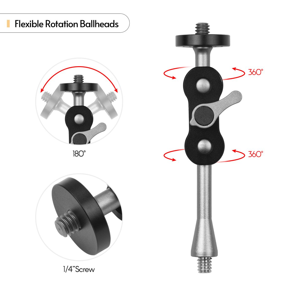 With dual rotatable ball heads, you can adjust the usage angle freely; and the side locking knob ensures easy and quick tightening.