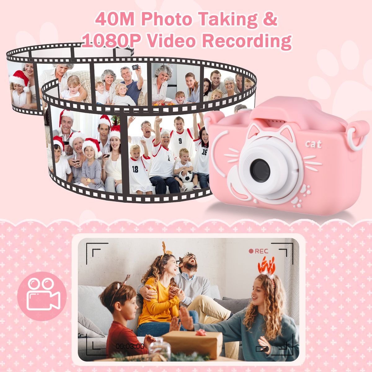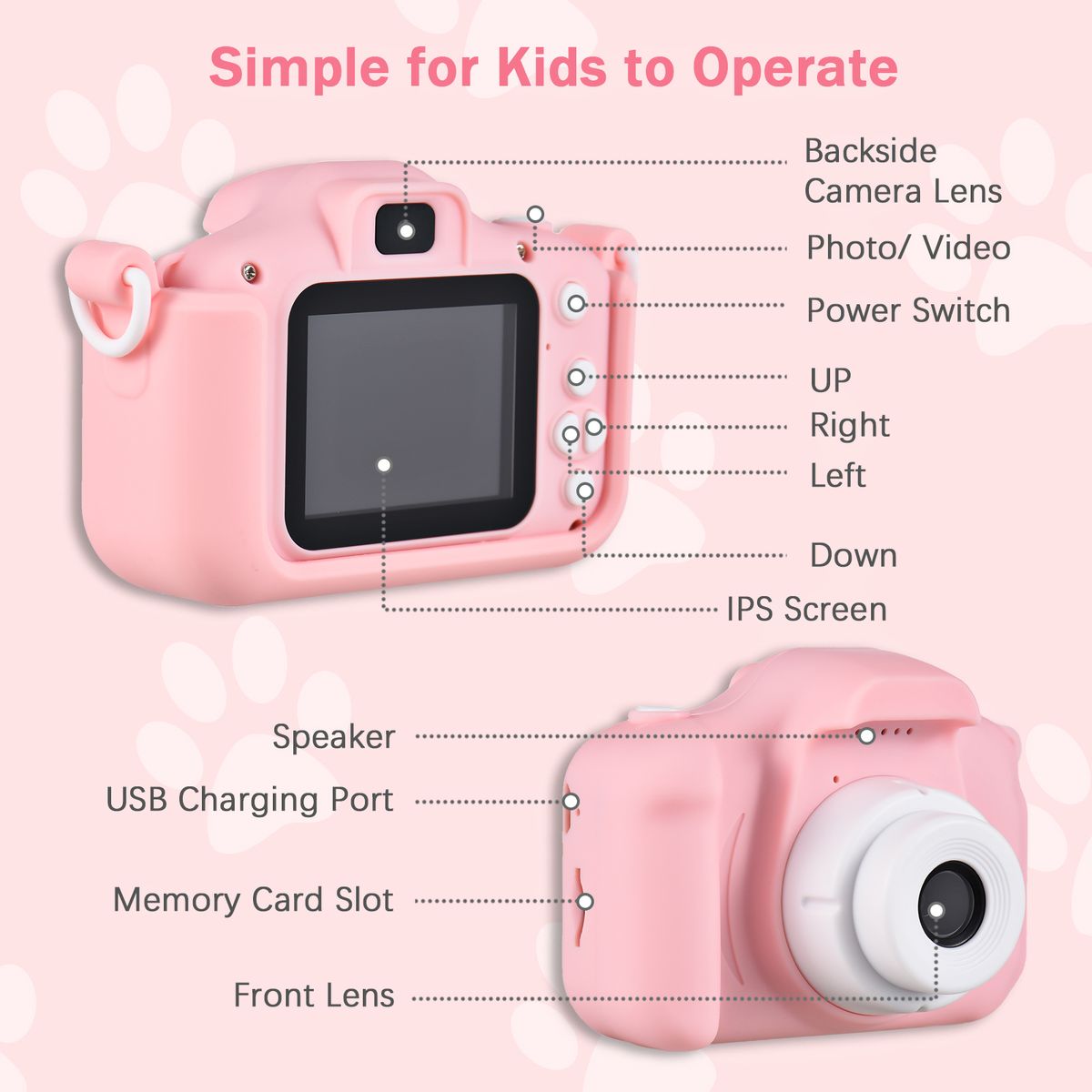 【Cute Digital Camera for Kids】Mini size design, suitable for kids' little hands; with front and back dual lenses, the kids digital camera can take max. 40M clear photos and record 1080P high definition videos. Kids can use this digital camera to record wonderful daily moment freely.
