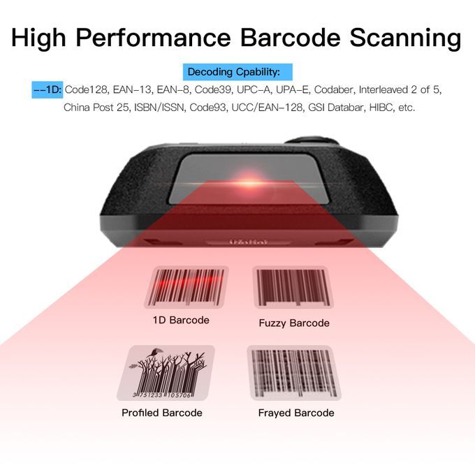 Decode Type: --1D: Code128, EAN-13, EAN-8, Code39, UPC-A, UPA-E, Codaber, Interleaved 2 of 5, China Post 25, ISBN/ISSN, Code93, UCC/EAN-128, GSI Databar, HIBC, etc.