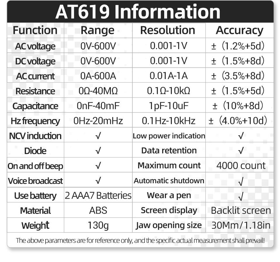 FeatureRanging:AutoUpdate Rate:3 times/secondsTrue RMS:YesNCV:YesDiode:YesData Hold:YesContinuity:YesLow Battery Alert:YesAuto Power Off:YesDisplay:4000 Counts(LCD)Product Name:Voice Clamp MeterBattery Type:1.5V AA battery*2(not include)Introduction:This product is a battery-powered,true-rms,auto-ranging digital clamp multimeter with a 4000 counts LCD display and a backlight.Electrical Specification: