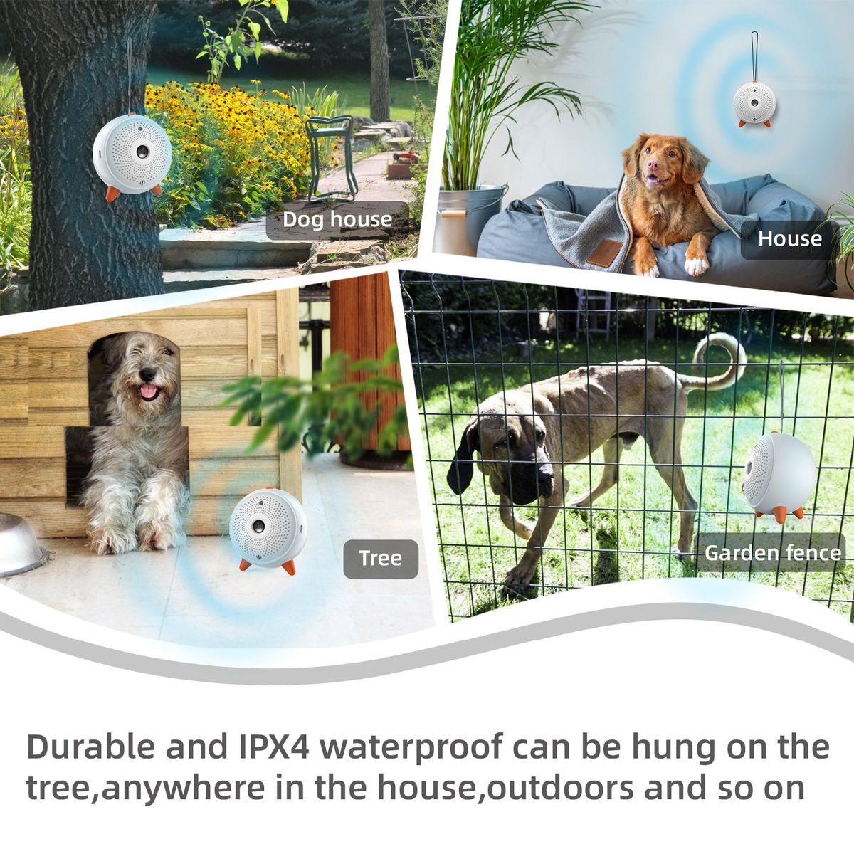 IPX4 waterproof dog barking device, anti-smashing, durable, weatherproof, sturdy, safe for indoor and outdoor use in any weather conditions. Equipped with a well-designed mini shape, which is light and easy to place or hung anywhere.
