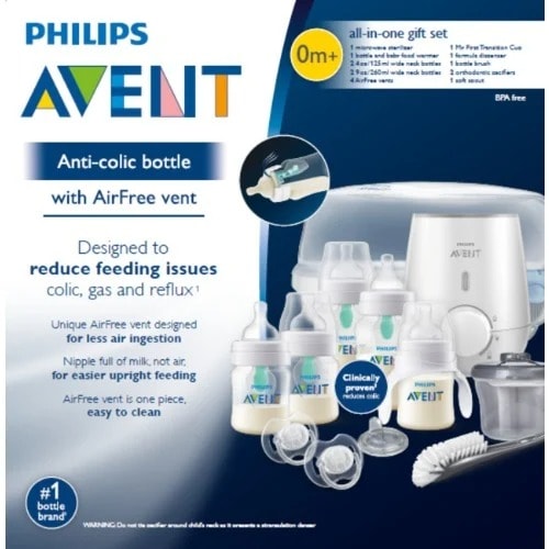 Philips AVENT Anti-colic bottle with Air Free vent all in one gift Set, SCD397/02st provides everything a new parent needs for safe, easy feeding and sterilizing. Each of the 4 BPA free anti-colic bottles includes an Air Free vent designed to reduce most common feeding issues including colic, gas, and reflux. This set includes 2 Anti-colic 9oz bottles with Air Free vents, 2 Anti-colic 4oz bottles with Air Free vents, 2 pacifiers, formula Dispenser, bottle warmer, microwave sterilizer, bottle Brush, my First transition Cup, and soft spout. The ultra-fast and easy to use microwave sterilizer kills 99.9% of harmful germs and sterilizes 4 bottles in just 2 minutes. The formula Dispenser holds 3 pre-measured portions of milk powder and is ideal for travel. The bottle Brush's curved brush head and molded tip cleans hard to reach areas. The My First Trainer Cup allows you to add handles to a familiar bottle and nipple and comes with a nipple and soft spout for easy training.