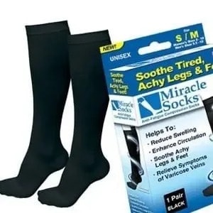 Helps reduce swelling in legs and feetGraduated compression enhances circulationSoothes aching legs and feetRelieves symptoms of varicose veinsMiracle Socks are just like regular socks but they're actually specially deisgned to relieve leg and ankle pain. Just by wearing it, you can improve circulation in your legs and relieve pain, thanks to the way it compresses and shapes your legs.