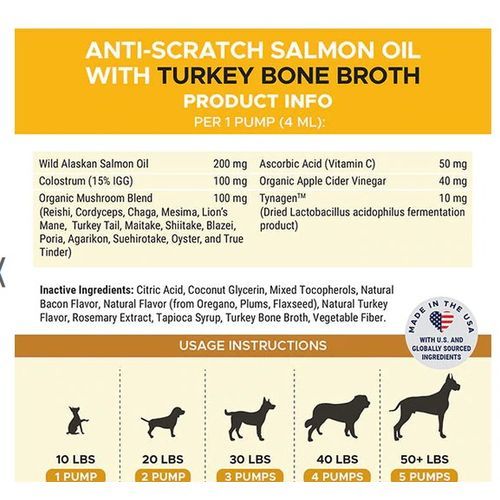 Vet-recommended for Skin, Allergy + Immune Support - This delicious Anti-Scratch Salmon Oil has a turkey bone broth base and is vet-recommended to support your dog's immune system, promote joint health, soothe allergy-related skin issues and support normal inflammatory pathways