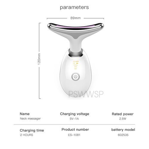Name: Neck Beauty Device Material: ABS Output voltage: 3.7V Battery capacity: 500mAh Power: 2.5W Input voltage: 5V=1A Size: 89x47x120mm Auto turn off: about 5 min Charging time: about 2h 3 Modes: ① Clean mode (CLEAN) Clean up trash from deep pores to shrink pores, eliminate acne, and solve dull skin. ② EMS mode (EMS) Effectively stimulate and relax the skin and help skin care product go deeply to keep skin moist. ③ Moist mode (HOT) Gently awakens and relaxes the skin, helping the skin restore its vitality. 6 Features: ①Positive and negative ions: utilize the principle of the absorption of positive and negative ions to remove the dirt in the deep pores and thoroughly clean them; through iontophoresis, the beauty ingredients are penetrated into the skin. ②Vibration: use mechanical vibration and voltage stimulation to tighten skin, increase elasticity, and increase metabolism. ③Warm: warm maage promotes absorption, so that wrinklescan be stretched and skin will become fuller. ④Red light: can effectively stimulate the skin, revitalize collagen, improve dark skin and reduce fine lines and wrinkles. ⑤Blue light: It can effectively improve skin problems, reduce acne and pimple and help to kill bacteria. Long term use can make skin rejuvenation and lead to a health skin. ⑥Green light: It can promote the microcirculation of the body surface, dredge lymph and drain swelling. Package includes: Neck beauty device*1 USB charging cable*1 User manual*1