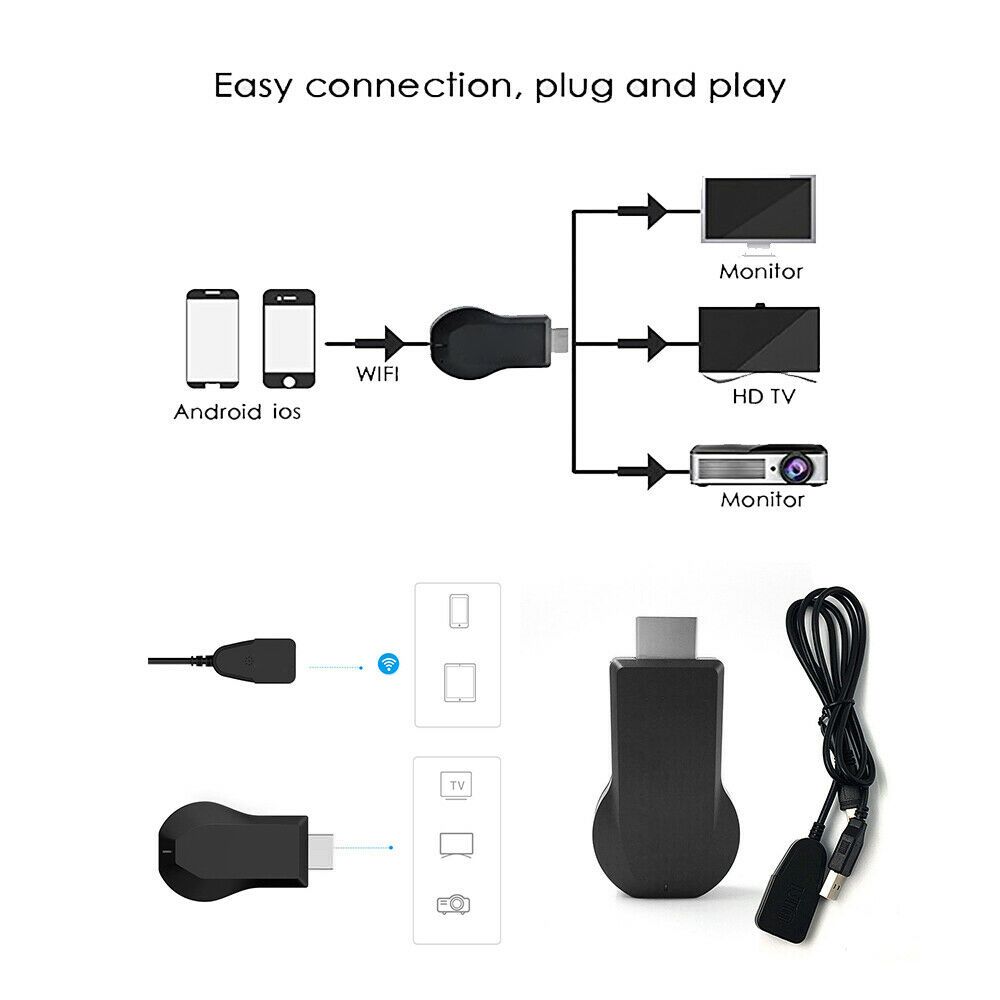 Description : This 1080P wifi streamer allows you to use it without installing any APP, is designed with a one-on switch. Features low power consumption and low heat.It is not easy to malfunction. Small size and lightweight, it won't take much space, convenient to carry or store. You can use it with projectors, smartphones, tablets, laptops, and more. Support 1080P resolution, the video will be ultra clear and provide you a good video quality. Specification : Resolution: 1080P. Color:Black Size(L x W x H): 6.50x3.50x1.50cm. Operation style: Replacement for Android. Note There might be a bit color distortions due to different computer resolutions. There might be a slight errors due to different hand measurement. Package included :