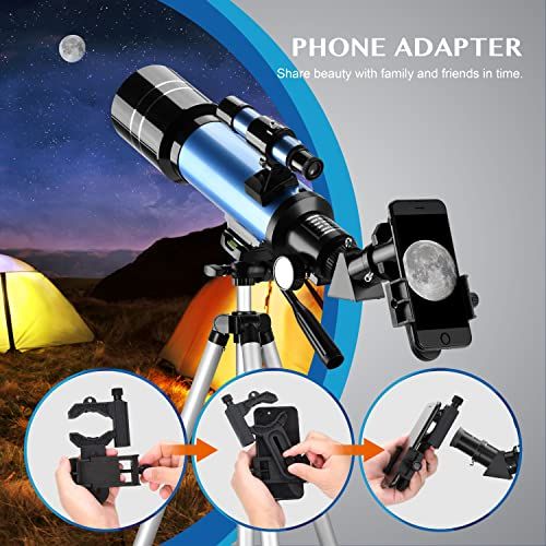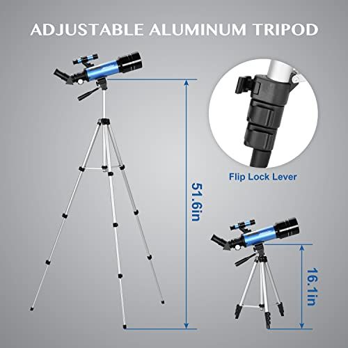 - Abundant Telesope Aessories: phone adapter makes it easy to observe and share with friends. The aluminum tripod an be adjusted from 15 to 51 for different positions. Star target planisphere is also inluded