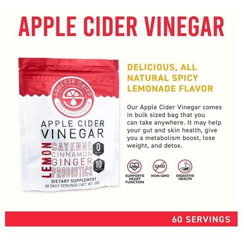 Get a jump start on your day with our Squeeze Dried Apple Cider Vinegar (ACV)! Simply add 1 scoop or 1 tsp of our ACV powder to your water and enjoy! Our special blend includes apple cider vinegar, lemon, cayenne, cinnamon, ginger, and probiotics.
