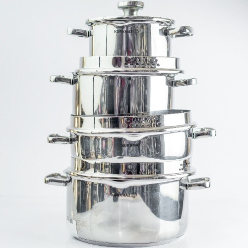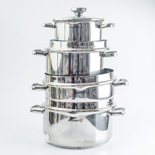 This Stainless Steel 6-Piece Cookware Set features a 9'' casserole pot with lid, 8'' casserole pot with lid, 7'' casserole pot with lid, 6'' casserole pot with lid, 6'' . This cookware set is suitable for all cooking surfaces. As it is made using stainless steel, this cookware set stays strong for years to come. The Stainless Steel 6-Piece Cookware Set has a thermal diffused base for fast heating. The handles are isolated from heat and offer a comfortable grip. The highly resistant glass lids with steam vents keep the moisture locked in and help cook flavorful meals.