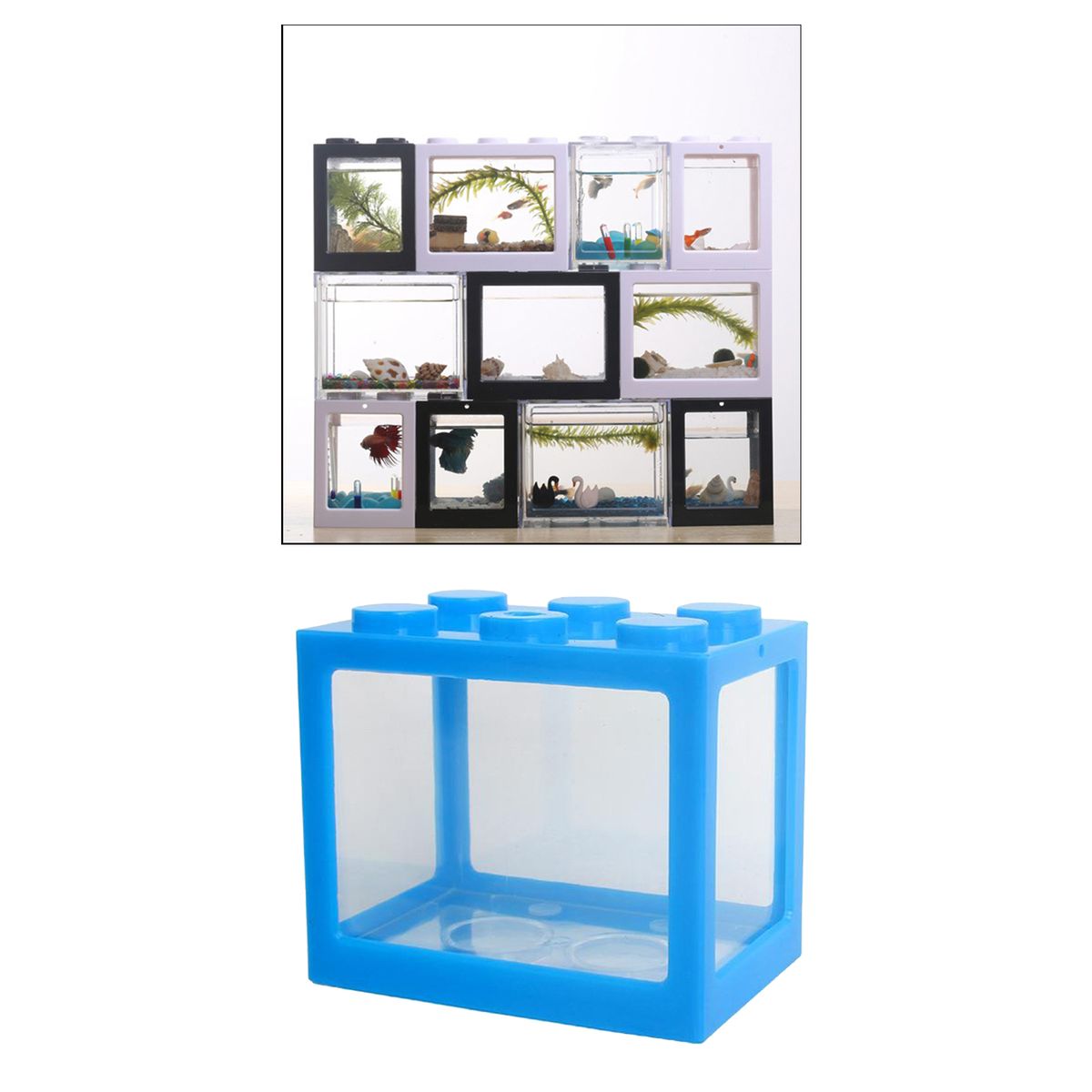 Mini Fish Tank: Creative stackable building blocks design, you can freely combine superimpose. Mini shape, the decorative fish tank looks beautiful.High Quality: Made of plastic, eco-friendly, durable and corrosion resistant.Dimensions: 12 x 10.5 x 8cm/4.7x4.1x3.1inch. The top of mini fish tank has a ventilation holes.Application: Perfect for small fish, like goldfish and siamese fighting fish. Also can feed all kinds of pets, seaweed balls, landscape tank. Exquisite Decoration: Nice decor for living room, office, tea table, desk decor, etc.