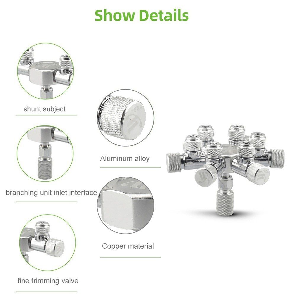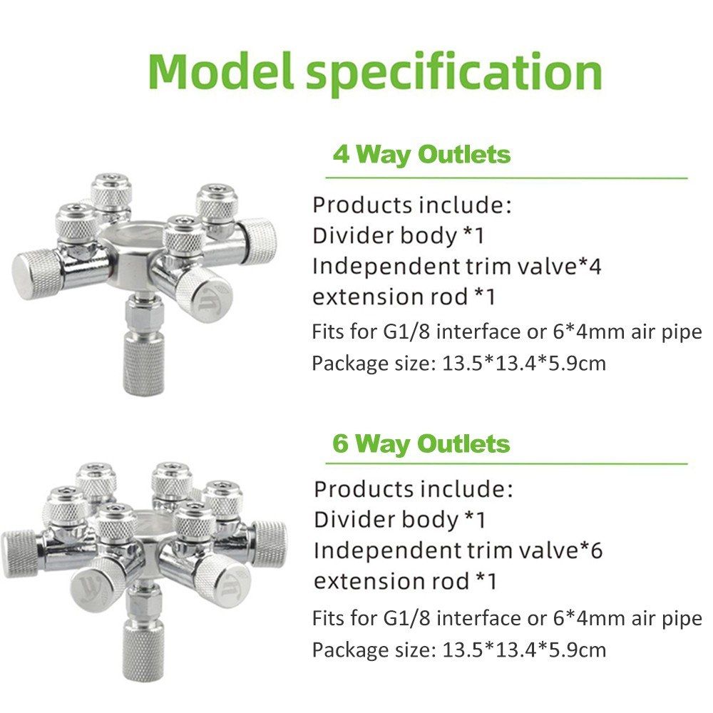 With this splitter, you can easily connect up to two or more CO2 diffusers from a single CO2 cylinder. The fine adjusting valve is used for adjust the amount of carbon dioxide finely, this valve with high adjustment fineness, there is no air leakage under the high pressure system. 4 kinds channel optional, can be used in multiple fish tanks at the same time. Keeping your aquatic plants healthy, more convenient and save energy.