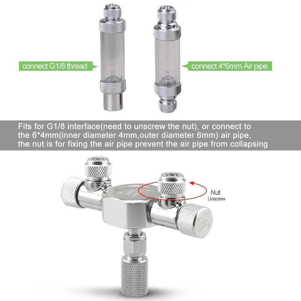 G1/8 INTERFACE OR 4*6MM AIR PIPE: Fits for G1/8 interface(need to unscrew the nut), or connect to the 6*4mm(inner diameter 4mm, outer diameter 6mm) air pipe, the nut is for fixing the air pipe prevent the air pipe from collapsing.