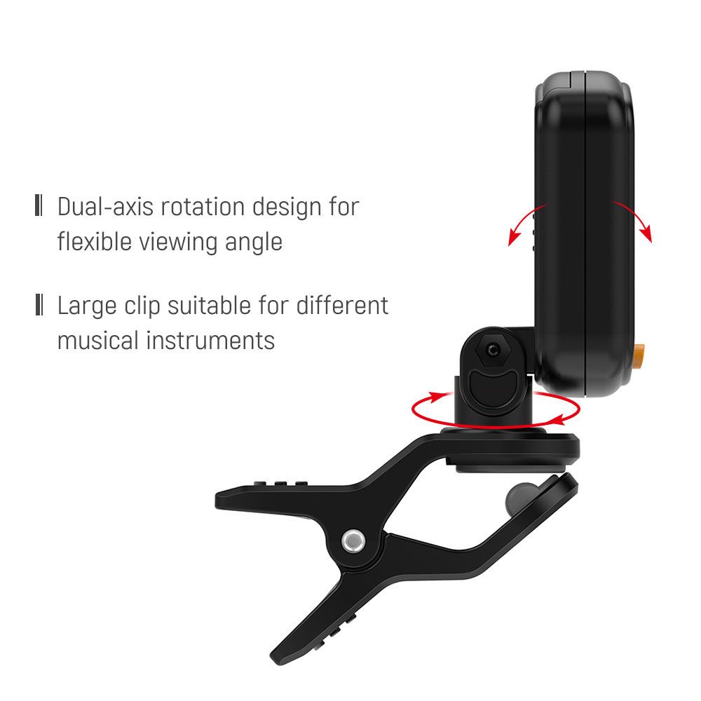 The electric tuner is large clip suitable for different musical instruments. It is dual backlight, one button operation, dual-axis rotation design for flexible viewing angle.