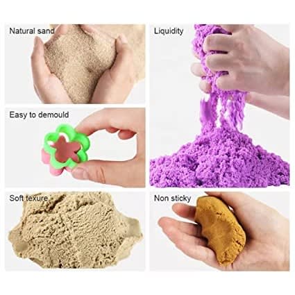 5 EXCITING MOLDS & ndash; Kids can build castles, pyramids, forts and more with the 5different molds included in this tub.This is one of the best sand for kids with moulds.. SAND SET & ndash; This special mixture of kinetic sand for kids with moulds doesn & rsquo;t dry out, allowing you to use it again and again.SENSORY SAND & ndash; This sand is kinetic Kinetic Sand is 98% sand and 2% magic, so you can pull it, shape it and mold it, to create incredible sand art.It sticks only to itself and not to you! This perpetually & ldquo;wet & rdquo; sand is perfect to mold, shape, and squeeze. This fun sensory activity is perfect for arts and crafts, and makes a great kids gift!STIMULATE KIDS CREATIVE SKILLS: Magic Sand is an educational and sensory toy kit, where kids can make just what they wish! Pack it, pull it, shape it, cut it, mold it and love it! This mold-able play sand is so incredible you can't put it down.LEARNING TOOL - Building their own sand environments will greatly boost your kiddos imagination and creativity! It also help them develop fine motor skills and enhance hand-eye coordination. Kids will grasp, pinch, knead and mould the sand and shape in different ways.