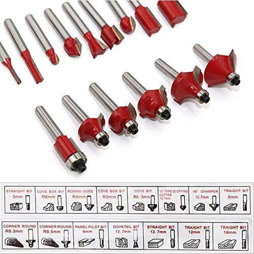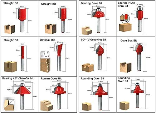 Details: Feature:1) This router bits are designed for portable and desktop woodworking mahines and annot be used on mahines suh as eletri drills and drill presses.2) Can be used for hard wood, softwood, syntheti board and so on to produe a smooth surfae, but to avoid proessing opper, iron and other metal materials and sand, stone and other non-wood materials. 3) If you need to use a ollet, please selet the appropriate size ollet.4) Use appropriate gles and ear protetion when operating.body, lothes and other debris an not be lose to the working tool.Speifiation:Material45# steel body and YG8 tungsten arbidePakage Inlude:2 X Corner Rounding Bit1 X Dovetail Bit1 X 45 Chamfer Bit1 X Bearing Cove Bit1 X Flush Trim Bit1 X Roman Ogee Bit4 X Straight Bit 2 X Cove Box Bit 1 X "V" Grooving Bit 1 X Mortising Bit