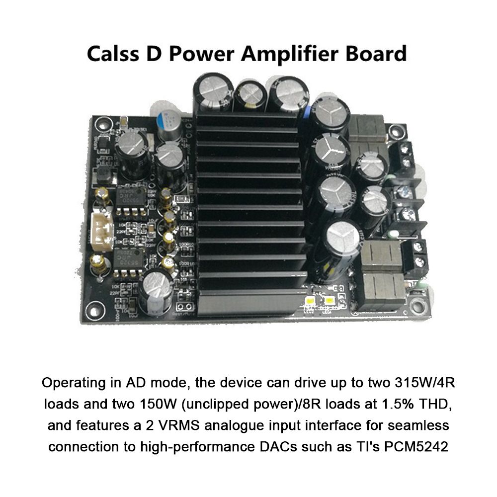 Operating in AD mode, the device can drive up to two 315W/4R loads and two 150W (unclipped power)/8R loads at 1.5% THD, and features a 2 VRMS analogue input interface for seamless connection to high-performance DACs such as TI\'s PCM5242.