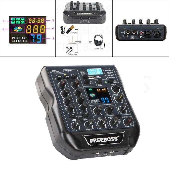 Audio Mixer;audio mixer 4 channels agas04b 99dsp effects us;musical instruments studio recording equipment;accessories mixers unpowered 24 bit sound card;usb 192khz 48v dc 3 band 1 stere live sound;usb record sound board card music console mixing