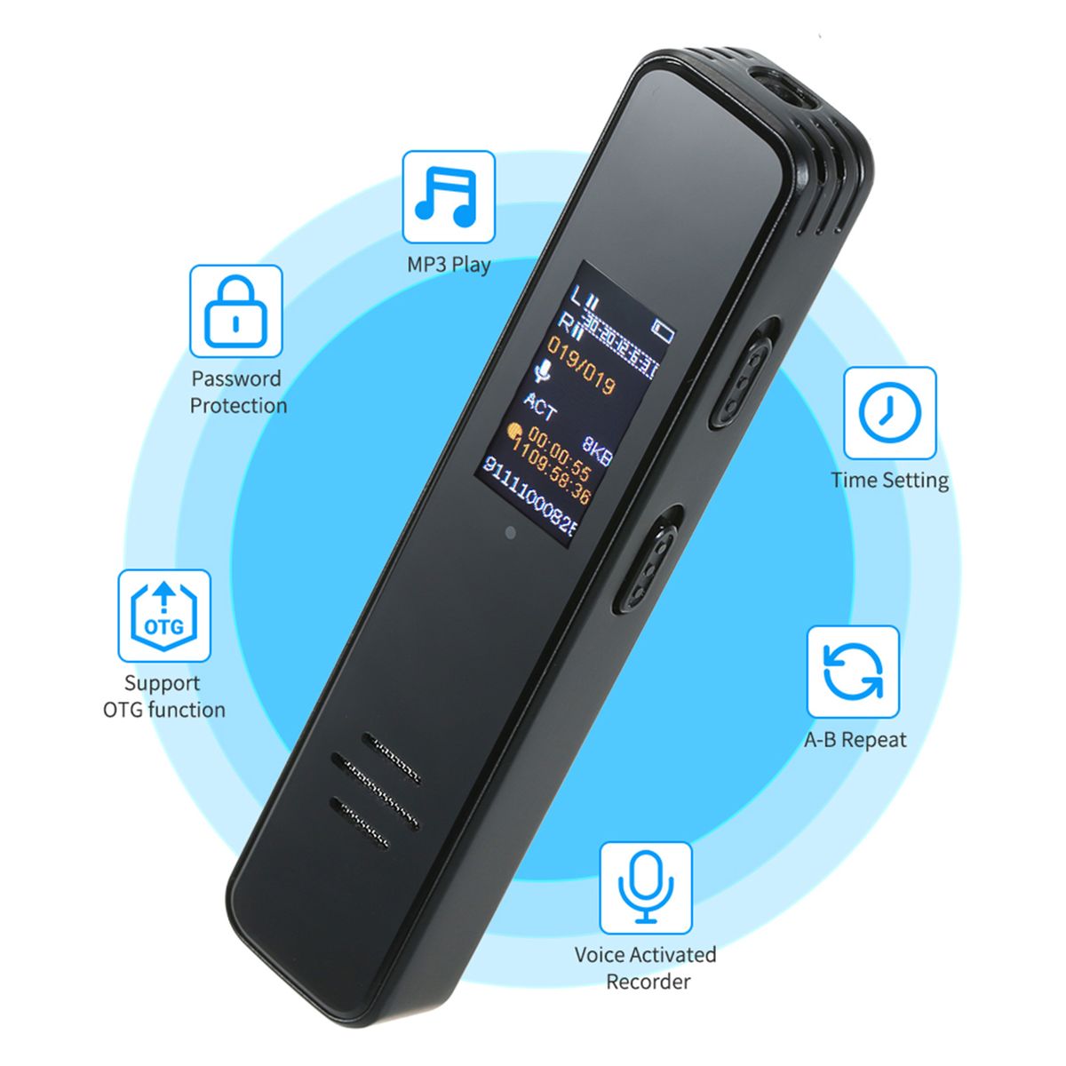 【Enhanced Capacity】 Support volume control, -forward & rewind, A-B repeat function, time setting, timer recording, password protection, gain setting, recording subsection, etc. 25 different languages for your selection. Built-in microphone & speaker. Support OTG function. (Note: mobile phone must support OTG)
