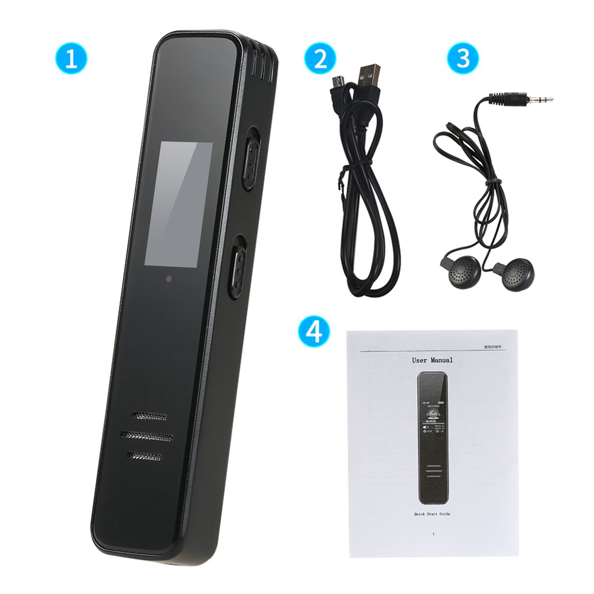 1 x Recorder,1 x USB Cable,1 x Earphone,1 x User Manual(English),