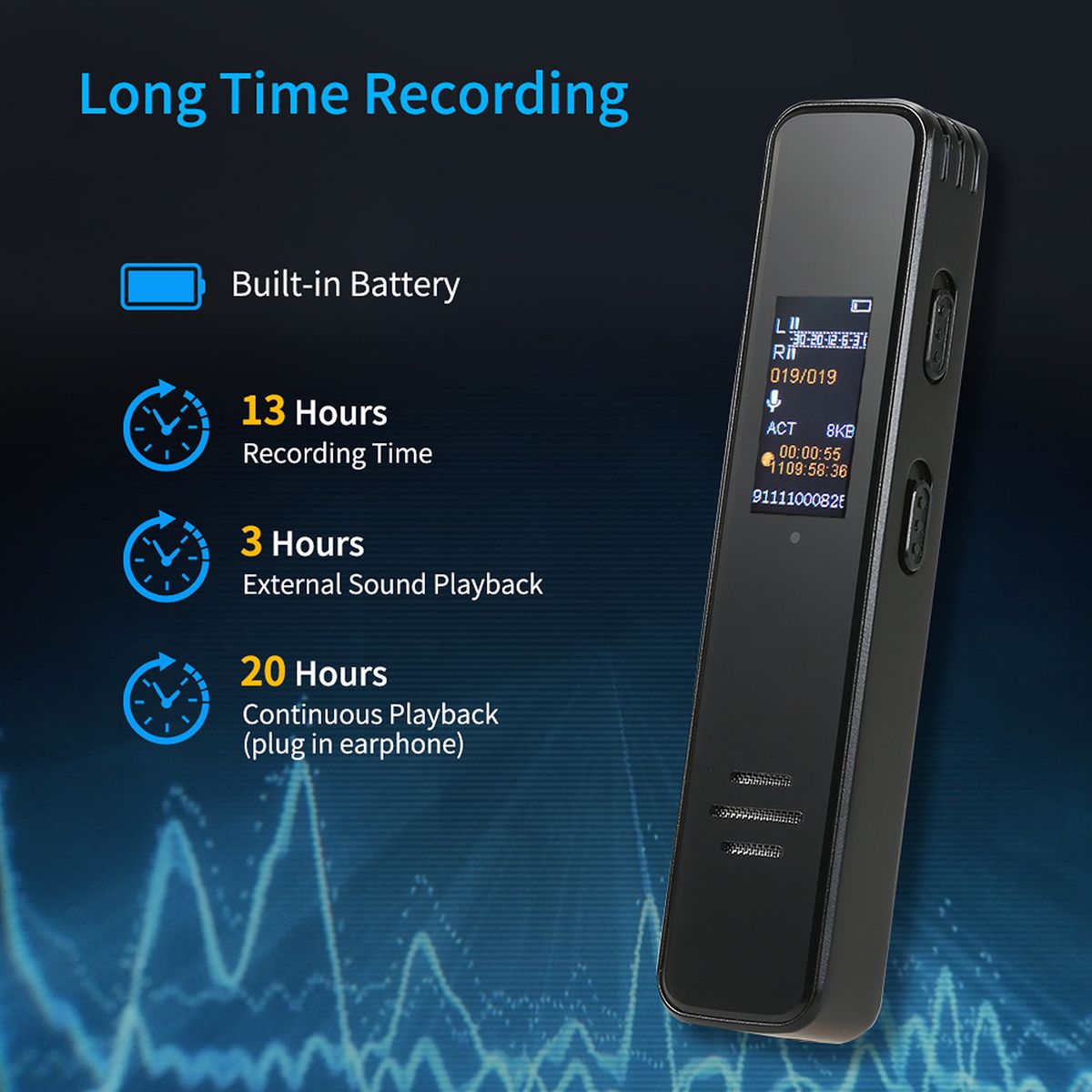 【Built-in Battery】 Built-in rechargeab-le battery, super capacity battery enable ultra-long time recording. When it is fully charged, about 13 hours for recording time, about 3 hours for external sound playback, about 20 hours for continuous playback(plug in earphone).