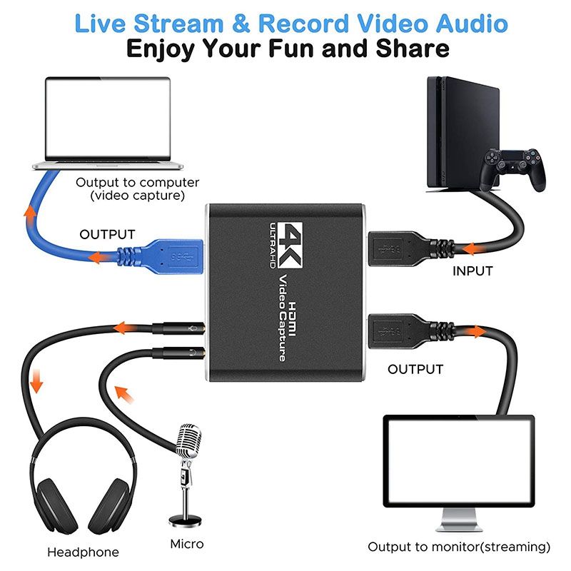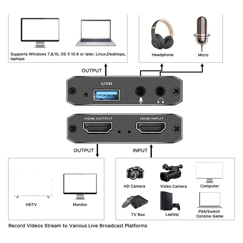 body { font-size: 75%; color: #000; font-family: Open Sans,Arial,Helvetica,sans-senif,SimSun,"宋体"; line-height: 1.3; } dl { margin: 0px; width: 480px; float: left; } dt { width: 100px; height: 15px; float: left; } dd { width: 240px; height: 15px; float: left; } dl dt { margin: 0px; line-height: 22px; color: #474747; font-size: 14px; font-family: tahoma; } #product-desc { width: 100%; height: 209px; } #description { width: 100%; height: 50%; } #details { width: 100%; height: 50%; } .ui-box-title { height: 30px; font-size: 15px; font-family: tahoma; font-weight: bold; background-color: #ddd; text-anchor: inherit; padding-top: 8px; margin: 0px; } .ui-box-body { margin: 0px; } #tbspecifics { border-right: 1px solid black; border-bottom: 1px solid black; } #tbspecifics tr { height: 30px; } #tbspecifics td { width: 100px; border-left: 1px solid black; border-top: 1px solid black; } [4K HDMI Game Capture Card]:game video capture card is designed with high-end smart , stylish and compact. Supports up to 4K@60fps HDMI input, plug and play let the device work instantly with stream media like OBS. Perfect for live streaming, gaming broadcast, video recording, conference rooms, etc. [HD 1080P 60fps Signal Loop Out]: This HDMI capture card for Nintendo Switch has maximum HDMI output resolution up to 4K@30fps, and streams 1080p@60fps video signal through USB 2.0 port. It outputs a clean and clear excellent inage quality without frame lag. You can enjoy recording specific moments in video game adventures. [3.5mm Microphone and Audio Input/Output Port]: You can connect the audio video capture device with your earphone with 3.5.mm audio out port, you can also connect the video capture device with 3.5mm Microphone so that you can stream your voice and record your voice by the ports easily. you can also use it to add external commentary when playing a game. [Wide Compatible with Multiple Systems]: 4K PC capture card is suitable for Windows 7/ 8/ 10, Mac OS X 10.9 or above, Linux and many other systems. Compatible with for PS4, for Nintendo Switch/3DS, for One, Camera, Webcame, DSLR, be real-time streaming on Twitch/Youtube/OBS/Potplayer/VLC more easily with your gameplay. [Notice]: Please note that the OBS Studio software needs to be restarted after audio settings are completed, otherwise it will cause no sound output. And you will get actual 1080p records by connecting USB port monitor after insert MIC/Audio Output devices colour:Black Material:Aluminum alloy Package Contents: 1 x acquisition card 1 x USB data cable 1 x user manual(English) Only the above package content, other products are not included. Note: Light shooting and different displays may cause the color of the item in the picture a little different from the real thing. The measurement allowed error is +/- 1-3cm.