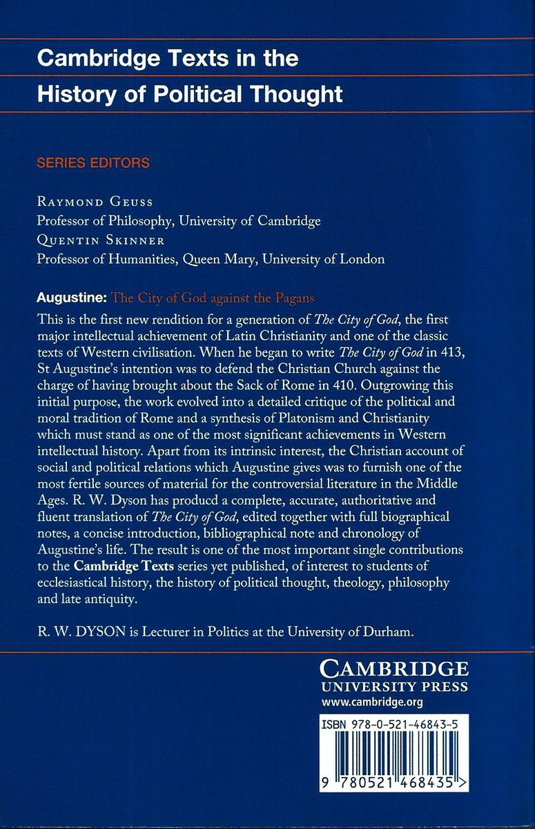 This is the first new rendition for a generation of The City of God, the first major intellectual achievement of Latin Christianity and one of the classic texts of Western Civilisation. Robert Dyson has produced a complete, accurate, authoritative and fluent translation of De Civitate Dei, edited together with full biographical notes, a concise introduction, bibliography and chronology of Augustine's life. The result is one of the most important single contributions to the Cambridge Texts series yet published.