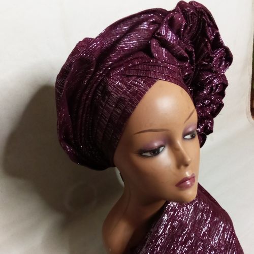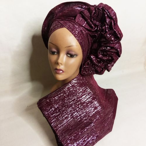This burgundy autogele ( ready to wear) is a beauty to behold. this style is unique and elegant . Suitable for brides, celebrants and classy ladies with good taste. designed carefully with 4 straps for easy wear and good fitting.has elastic band to make it adjustable for all head sizes . made with shiny light weight asooke and sits comfortably on the head.
