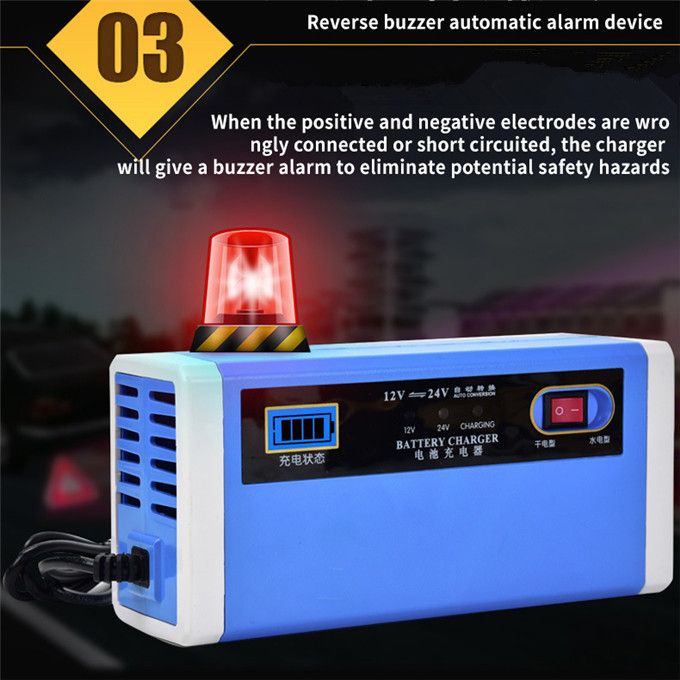 03Reverse buzzer automatic alarm deviceWhen the positive and negative electrodes are wrongly connected or short circuited, the chargerwill give a buzzer alarm to eliminate potential safety hazards