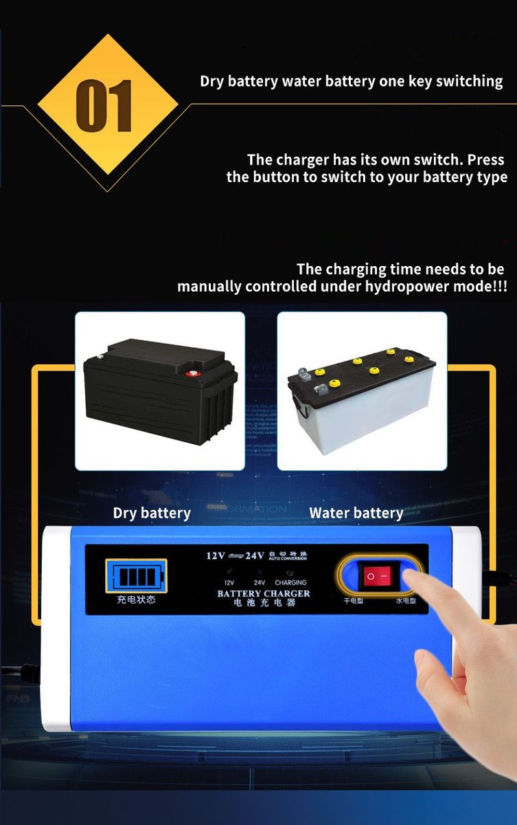 01Dry battery water battery one key switchingThe charger has its own switch. Pressthe button to switch to your battery typeThe charging time needs to bemanually controlled under hydropower mode!!