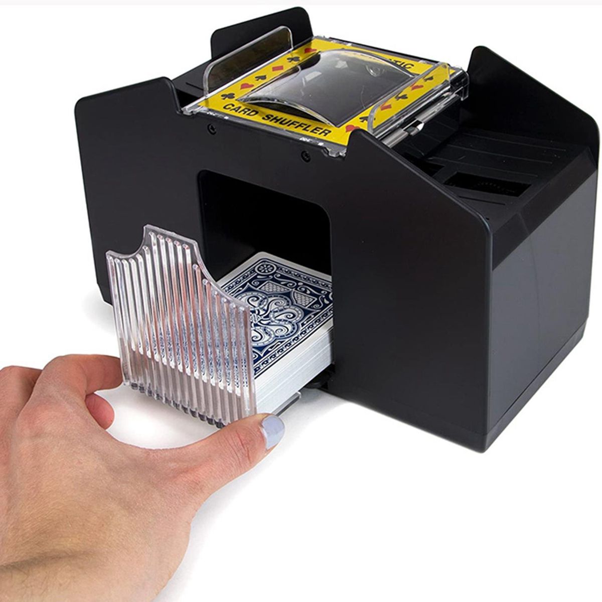 Evenly shuffles playing cards, ensures that cards are not accidentally bent, cards are shuffled in seconds, save time and effort