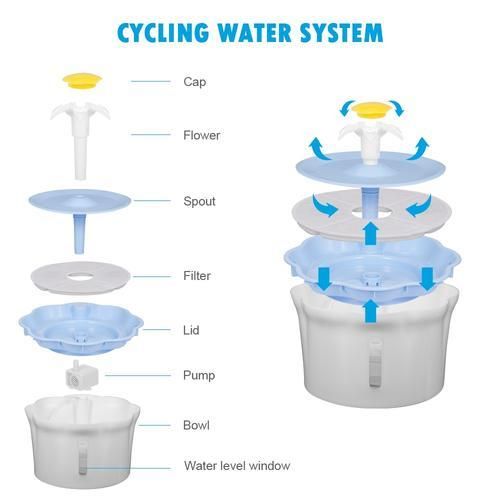 3 Different Flowing Designs:Pet Fountain has 3 modes: Lily flower waterfall, flower bubble, and gentle fountain, each mode meets the needs of various pets.