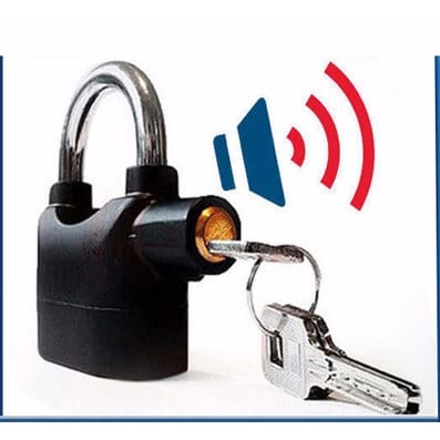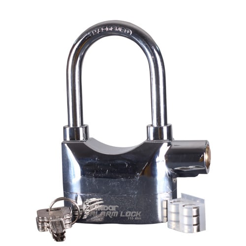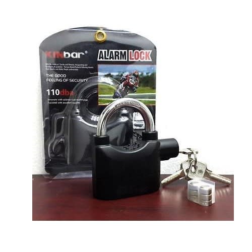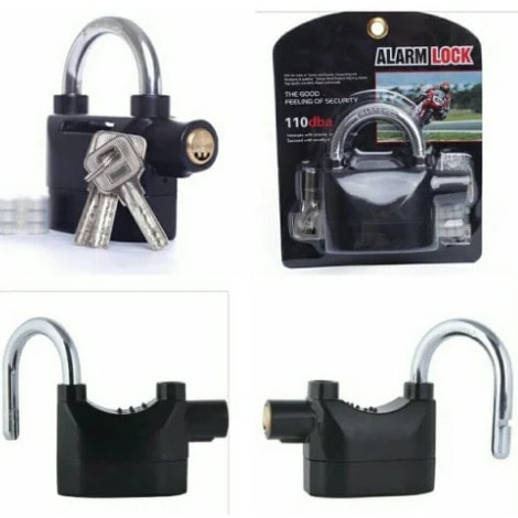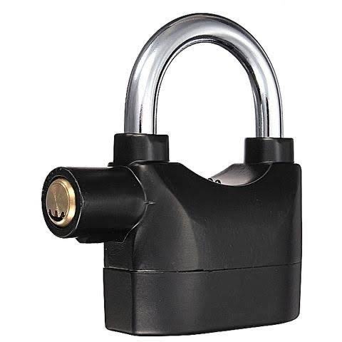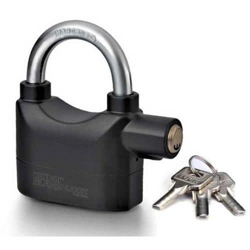 It makes siren noise when touched, hit or senses vibration. This Lock Alarm is a hardened steel padlock which has an in-built alarm which will omit a siren of 110 decibels if touched or tampered with in any way thus alerting you to unwanted attention. High security design made of durable steel 96 - 98 db alarm that sounds when tampered Two settings - active alarm and inactive alarm Suitable for all weather conditions Powered by 6 lithium batteries Keep your bike, garage door, garden shed, side gate tool box locker, or anything you desire secure with this Heavy Duty Siren Alarm Padlock.This lock comes equipped with two settings, armed and unarmed, so you can be alerted by a 96 - 98 db alarm when the lock is tampered with. Basically, double the protection. The Heavy Duty Siren Alarm Padlock has a body made of extra strong cast steel as well as a high-grade steel shackle. Features
