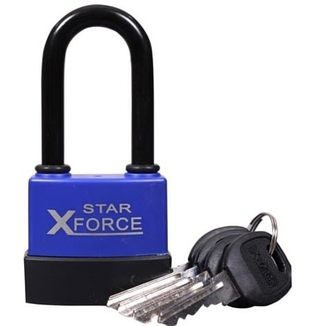 Star Xforce weatherproof laminated steel padlock body is covered by a tough blue-black thermoplastic jacket for maximum protection. Shackle-way resists water and dirt intrusion. Case hardened steel shackle protects against sawing and cutting. Exposed portion of shackle is coated with protective black thermoplastic for maximum weather resistance. Precision engineered double locking mechanism on both shackles provides added security and strength. Padlock body constructed of laminated riveted plate steel for maximum strength. Protective bumper surrounds padlock to cushion impacts and prevent damage to doors and painted surfaces. Thermoplastic keyway cover seals out moisture, dirt and debris. Brass pin cylinder resists picking, provides long life and smooth operation. Each Guard Security padlock is individually tested at the factory to ensure smooth performance before packaging. Rust resistant nickel plated brass keys. Lifetime warranty.