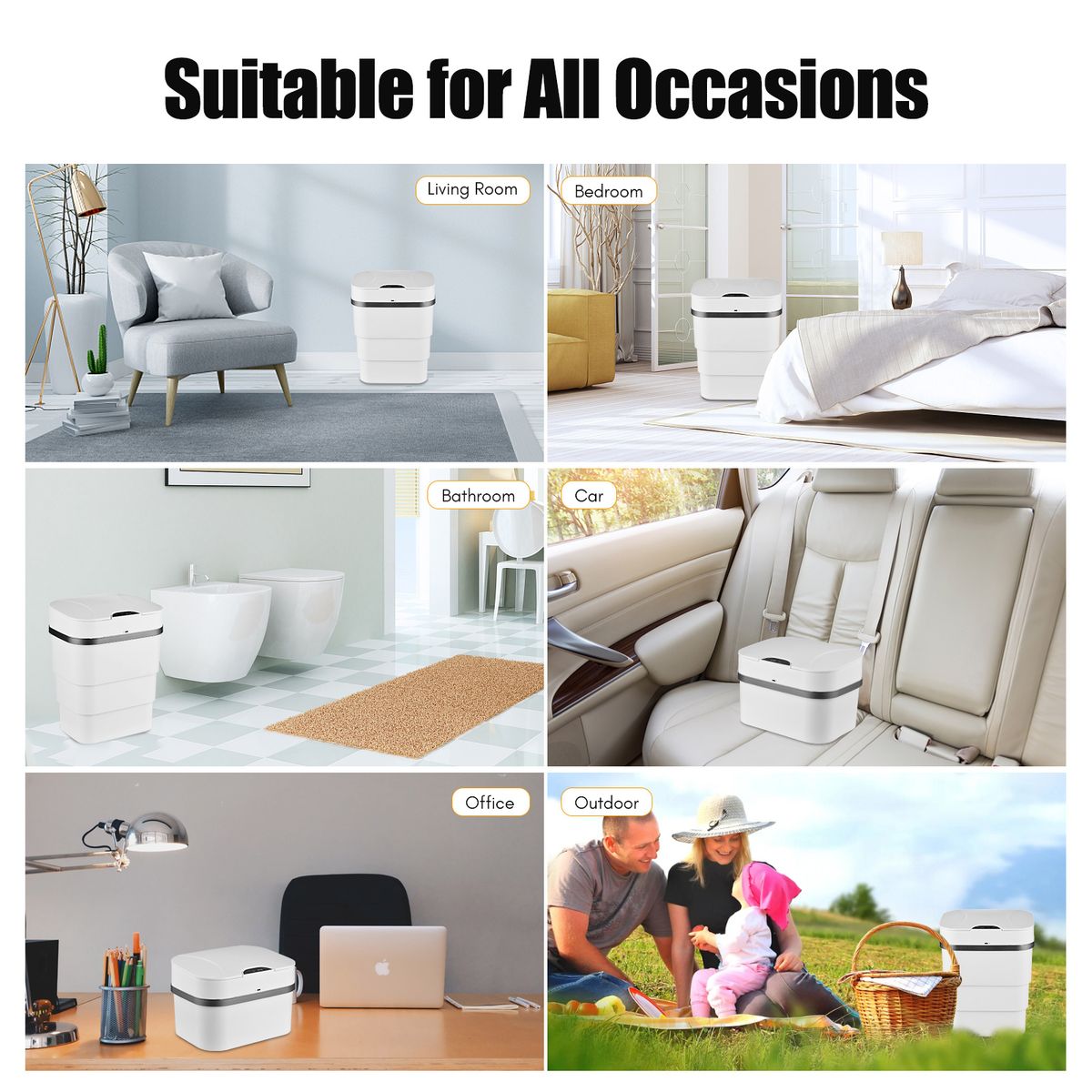 【Suitable for All Occasions】This folding automatic trash can is not only suitable for kitchen, living room, bedroom, bathroom, office, etc, but also can be used as a desktop trash can or a car trash can.