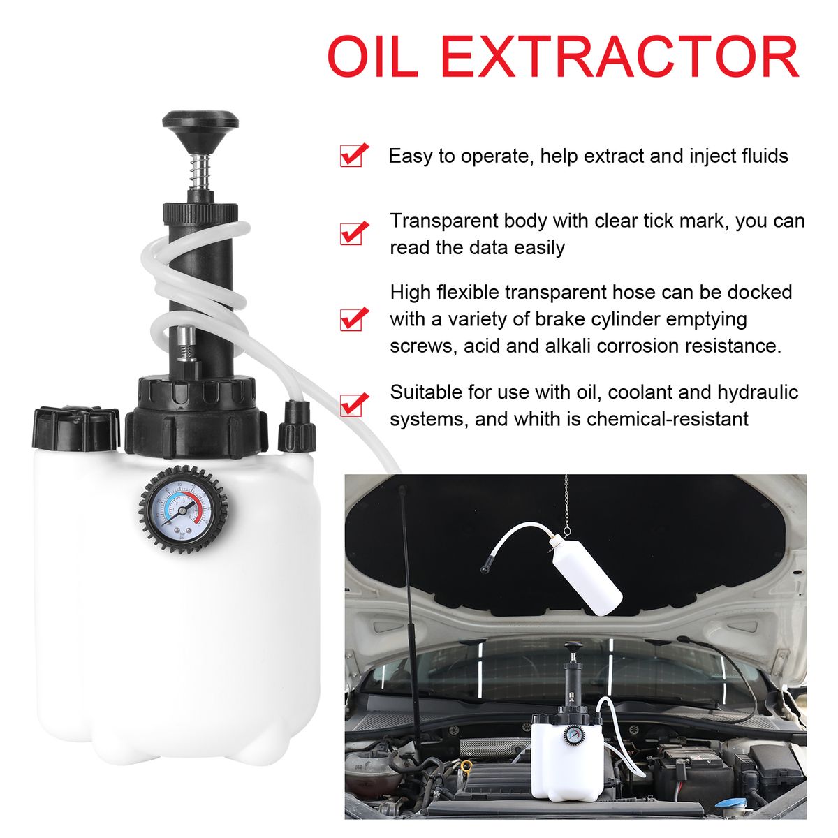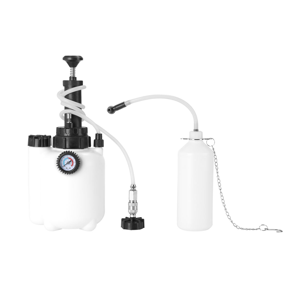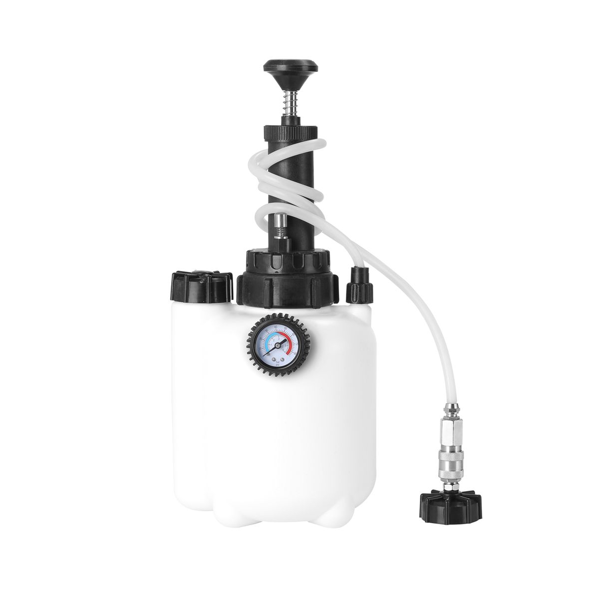 This automative brake system bleeder is made of quality material, 3L large capacity also comes with 1L suction bottle. Not only easy to wash, but also practical and facilitates brake bleeding on a wide variety of vehicle types. Equipped with colorful pressure gauge, and the data is easy to read. There are two units on the pressure guage, bar(0-6) and psi(0-85). You can have a try.