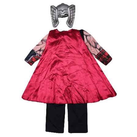The Deluxe Thor Costume includes a muscle chest blue and silver jumpsuit which really makes you look like you have the muscles of Thor! Featured on the jumpsuit is the printed metal effect plated sleeves, padded silver discs and padded muscles on the arms and chest of the suit. Also included is Thor's classic red cape. This costume is available in sizes 5 to 6years and 9 to 10 years.