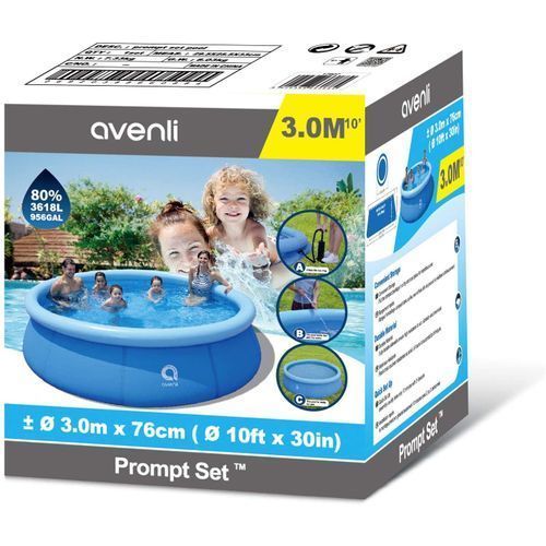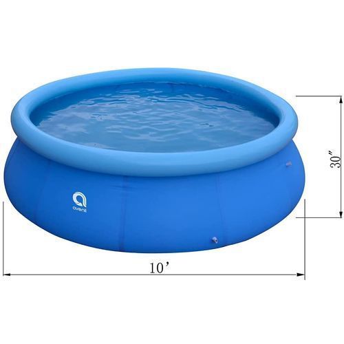 Enjoy hours of refreshingly fun family activity in this swimming pool with super easy set up (no tools needed). Just fill the upper ring with air and then fill the pool with water. This JLeisure Prompt Set Swimming Pool is ready for water in 10 minutes!Prompt Set above ground swimming pools is great for both adults and kids. These inflatable pools drain conveniently. The durable sidewalls are made with 3 separate layers of material for extra strength and durability. This pool will resist even the roughest treatment. The drain plug accepts a garden hose to drain water away from the pool area as desired. Prompt Set above ground pools is much easier to disassemble than any rigid steel-walled pool, too! Family members of all ages and sizes can enjoy a soak in the JLeisure 10-foot x 30-inch Prompt Set Above Ground Inflatable Round Swimming Pool!Whether you need a little extra cooling off on a hot summer day or a way for your kids to enjoy a swimming pool in the comfort of your own backyard, the JLeisure Prompt Set pool is a great option for both.Pool pump sold separately, this above ground pool will work with the JLeisure 29P414US 300Gal/H Cartridge Pump (not included).JLeisure Prompt Set Above Ground 10-foot x 30-inch pool for ages 6 and upSuper tough sidewalls made with 3 separate layers of material for durabilityPuncture-resistant materialDrain plug accepts a garden hose to drain water away from the pool area as desiredPerfect size for everyone in the family to enjoyNo tools needed for setup, ready for water in 10 minutesStoring during the off-season is a breeze and will extend your above ground pool's life indefinitelyDisclaimer: Please review your HOA rules and restrictions before purchasing this product; Not all housing agencies permit private above-ground poolsPool pump sold separately, this above ground pool will work with the JLeisure 29P414US 300Gal/H Cartridge Pump (not included)Pool type: InflatableMaterial: PVC plasticHeight: 30 inchesDiameter: 10 feetCapacity: 2-3 peopleCapacity: 956 gallons of water at 80% fullColor: BlueManufacturer warranty: 6-month warranty