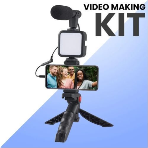 The video making kit for all kinds of phones and camera is a kit designed for smartphone camera video recording with 3.5mm TRRS plug microphone, universal for Vlog making, interview, live streaming, online makeup, video chatting and more.Features:Noise Reduction Microphone: The microphone features cardioid wide pickup range and powerful noise canceling technology, plus high quality mic for high quality recording.6500K LED Light: 49pcs lamp bead provides the light 6500K color temperature and 5W output , powered with 2pcs AA batteries(not included), for brighter and uniform video lighting.Universal Phone Clamp: The phone holder clamping range is about 5.4-8.3cm/2.13-3.27in, widely for mostly used smartphones. Top cold shoe mount enables quick microphone and LED light mounting.Dual Use Tripod Handle: Designed with foldable plate, the tripod is dual applicable for hand gripping and table settling, ergonomic designed shape makes gripping more comfortable.Wide Application: The kit is designed for smartphone video recording with 3.5mm TRRS plug microphone, universal for Vlog making, interview, live streaming, online makeup, video chatting and more.Specifications:Main Material: Plastic Specification item: value Certification: Handheld Microphone, Desktop, wired microphoneUse for video vlogging